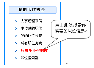 注意:如果你是應(yīng)屆畢業(yè)生可以進(jìn)入"個(gè)人管理中心",位于左側(cè)子欄目的"我的工作機(jī)會(huì)",點(diǎn)擊"應(yīng)屆畢業(yè)生職位"如下圖所示: