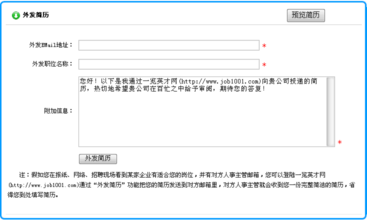 2) 在打開(kāi)的頁(yè)面中,輸入接收企業(yè)的Email地址、應(yīng)聘的職位名稱以及您的其它要求后,點(diǎn)擊"發(fā)送簡(jiǎn)歷"按鈕就可以了。如下圖所示: